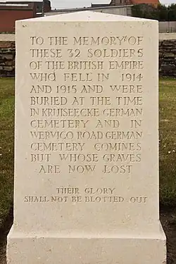 The cemetery, designed by the English architect Charles Holden and administered by the Commonwealth War Graves Commission, is located on the Kruisekestraat Road, to the east of Ypres. A Cross of Sacrifice is positioned in the southeast corner of the cemetery while a Stone of Remembrance is midway along the east wall.[2] The cemetery also contains a memorial to 32 British soldiers originally buried in German military cemeteries but whose graves were unable to be located in the postwar period.[1]