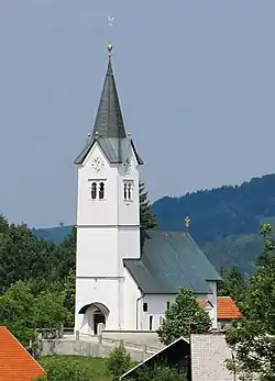 The parish church in the settlement is dedicated to Saint Ulrich and belongs to the Koper Diocese.[7] It is a Baroque building dating to 1647 with an octagonal chancel walled on three sides, a wide rectangular nave, and a belfry. The interior of the nave and the chancel are ornamented with frescoes dating to 1713. Additional remodeling took place in 1747.[8] The church is surrounded by a cemetery.