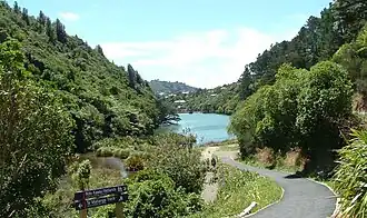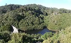 Historically about 60% of the Wellington region was covered with broadleaf forest. Karaka, kohekohe, ngaio and nīkau trees were common but there were also rātā, rewarewa and tawa with occasional podocarps like kahikatea and rimu.[5] The whole sanctuary valley was covered with this sort of forest until European settlement of the area and the large fires in 1850 and 1860 that cleared the land to be used for farming. Following the discovery of alluvial gold in the Kaiwharawhara stream in 1869, there was a small 'gold rush' in the area. This was soon replaced by quartz mines, but poor returns and the completion of the waterworks dam in 1873 lead to the end of mining in Karori.[6] Parts of the area continued to be farmed up until 1906 when the remaining catchment was purchased for the water works.[7] The upper reservoir, retained by a concrete gravity arch dam, was completed in 1908.[8] From this point, as the whole valley was a protected water catchment area for Wellington city, the slopes were re-vegetated with introduced trees and the native forest also began regenerating. The upper dam was decommissioned as a reservoir about 1991, the lower one in 1997.[7]