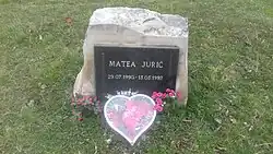 The first official civilian victim of the Bosnian War in Zenica was a two-year-old Croat girl named Matea Jurić (29 July 1990 – 13 May 1992), who was killed by a gunshot during the blockade of the military barracks of the JNA in the urban settlement of Bilimišće. A memorial was erected in her honour.[26]