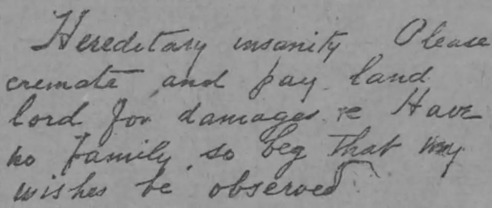 "Hereditary insanity. Please cremate and pay landlord for damages, etc. Have no family, so beg that my wishes be observed"