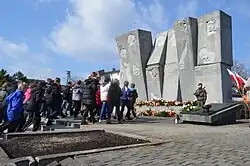 On 20 March 1942, the Germans carried out a public execution of 100 Poles in the town, who were then buried in Lućmierz-Las.[9] A memorial was erected at the site of the massacre after the war.[9] Around 50 Poles from Zgierz took part in the Warsaw Uprising in 1944.[3] In total over 7,600 inhabitants of Zgierz died under German occupation, which ended in January 1945.[3]