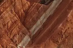 In 2005, Zhangye Danxia was voted by a panel of reporters from 34 major media outlets as one of the most beautiful Danxia landform areas in China. In 2009, Chinese National Geography magazine chose Zhangye Danxia as one of the "six most beautiful landforms" in China.[2] The area has become a top tourist attraction for Zhangye. A series of boardwalks and access roads have been built to help visitors to explore the rock formations.[4] In 2014, 100 million yuan was invested to improve the facilities in the Binggou area.[3]
