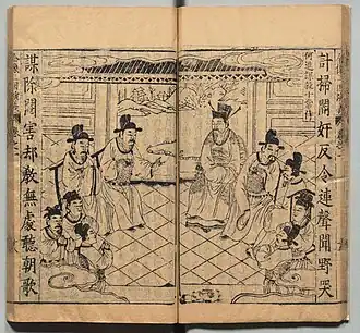 Two of the eunuchs, Zhang Rang (張讓) and Zhao Zhong (趙忠), started serving in the Han imperial palace as attendants holding the rank of jishi shengzhong (給事省中). Zhang Rang was from Yingchuan Commandery (潁川郡; around present-day Xuchang, Henan) while Zhao Zhong was from Anping Commandery (安平郡; around present-day Jizhou, Hebei).[1] They were promoted to xiao huangmen (小黃門) during the reign of Emperor Huan (r. 146–168). In 159, Zhao Zhong participated in a coup against Liang Ji, a highly influential general who monopolised state power in the 150s, and succeeded in ousting him from power. In recognition of Zhao Zhong's efforts, Emperor Huan enfeoffed him as a marquis of a chief district (都鄉侯). In 165, Zhao Zhong was promoted to a secondary marquis (關內侯) and allowed to draw an annual salary of 1,000 hu of grain.[2]