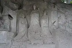 The Perfected who appeared to Yang Xi constituted three groups.[7] The first were early saints in the Shangqing movement. The three brothers Mao Ying (茅盈), Mao Gu (茅固), and Mao Zhong (茅衷), referred to as the Three Lords Mao, supposedly lived in the Western Han dynasty. Perfected Lady Wei Huacun (252-334), a Way of the Celestial Masters adept proficient in Daoist meditation techniques was among the Perfected, and she became Yang's xuanshi (玄師, Teacher in the Invisible World).[8] Another notable example is the legendary xian transcendent Zhou Yishan (周義山, b. 80 BCE). The second group includes Yang Xi's bride, the Perfected Consort An (安妃), the Ninefold Florescent Perfected Consort in the Upper Palace of Purple Clarity, and her mythological parents Master Redpine and Lady Li (李夫人). The third are the Queen Mother of the West's daughters, such as the Lady of Purple Tenuity (紫微夫人) who served as matchmaker between Yang Xi and Consort An.