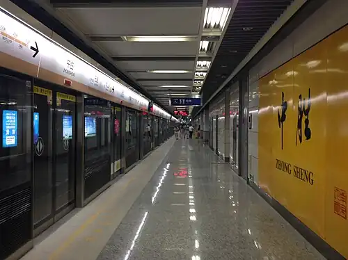 Zhongsheng station (simplified Chinese: 中胜站; traditional Chinese: 中勝站; pinyin: Zhōngshèng Zhàn) is a railway station on Line 10 of the Nanjing Metro. When it began operations on 3 September 2005,[1] it was part of Nanjing Metro Line 1's Phase I[2] from Maigaoqiao to Olympic Stadium. On 1 July 2014,[3] with the opening of Line 10, the former branch of Line 1 from Andemen to Olympic Stadium became re-designated as Line 10.[4] On 28 December 2023, with the opening of the southern part of Line 7, it became an interchange station between Line 7 and Line 10.[5]