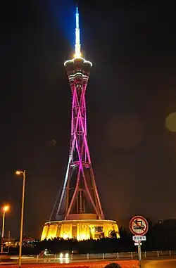 Zhongyuan Tower, also known as Henan Radio and Television Tower or "Tower of Fortune", is located in Zhengzhou, China.[1] It is a multi-functional commercial, artistic and cultural center integrating radio and television broadcasting, tourism, cross-border trade, cultural performance, catering and leisure.[5] The tower measures 268 metres (879 ft) high and the top antenna is 120 metres (390 ft) high, with a total height of 388 m.[6] It is the world's second tallest steel tower after the Tokyo Skytree.