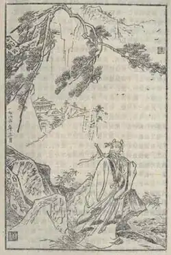 Zhou's portrayal as their teacher is connected to a recurring element in Chinese fiction where Tang and Song dynasty heroes train under a "celestial master", usually a Taoist immortal, prior to their military exploits.[71] C. T. Hsia suggests the mold from which all other similar teachers are cast is Guiguzi, master of the feuding strategists Sun Bin and Pang Juan,[72] from the Yuan dynasty tale Latter Volume of the Spring and Autumn Annals of the Seven Kingdoms (七國春秋後集).[71] Hsia goes on to say that Qian Cai, Yue's fictional biographer, associated Zhou with the outlaws because "most such teachers [in the military romance genre] are celestials" with at least two students.[73] But in adopting this format, Qian reversed the traditional pattern of "celestial tutelage" since Zhou is written as a human, while his students are reincarnations of demons (Lin and Lu) and the celestial bird Garuda (Yue Fei).[74][75]