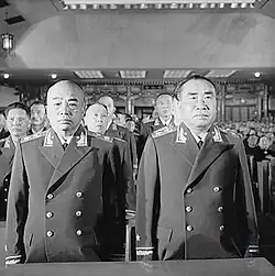 In 1949 Zhu was named Commander-in-Chief of the People's Liberation Army (PLA).[39] From November 1949 to May 1955, he served as the first secretary of the Central Commission for Discipline Inspection.[40] Zhu also served as the vice-chairman of the Communist Party (1956–1966) and vice-chairman of the People's Republic of China (1954–1959).[41] Zhu oversaw the PLA during the Korean War within his authority as Commander-in-Chief. In 1955, he was conferred the rank of marshal.[42] At the Lushan Conference, he tried to protect Peng Dehuai, by giving some mild criticisms of Peng; rather than denouncing him, he merely gently reproved his targeted comrade, who was a target of Mao Zedong. Mao was not satisfied with Zhu De's behavior.[43] After the conference, Zhu was dismissed from vice chairmen of Central Military Commission, not in least part due to his loyalty for the fallen Peng.[36]
