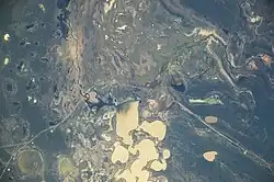 ![]() 2016 ISS image with the Zhymyky flowing into lake Shubarteniz from the northeast | |
