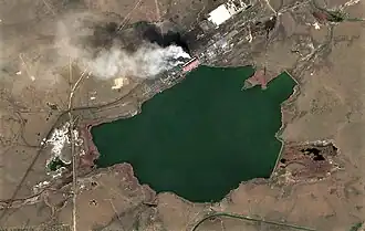 Zhyngyldy is one of the main lakes in the area surrounding Ekibastuz and is part of the Irtysh Water Management Basin. It is located 11 kilometers (6.8 mi) to the north of the city. The Ekibastuz GRES-1 Power Station rises by its northern shore. The reservoir was formed by filling an endorheic intermittent lake (sor) with water from the Irtysh–Karaganda Canal in order to cool the adjacent thermal power station. The ashes of the station are dumped into nearby lake Karasor.[2][3]