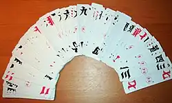 These cards originated from Leshan, Sichuan during the middle of the Qing dynasty and then spread outwards to other parts of southern China. The special deck has two series of cards numbered from one to ten.[2] One series of cards features numbers written in an "ordinary" style (数字小写), while the other series of cards has numbers written in a "formal" style (数字大写). Every card is quadrupled to bring the total to 80 cards.[2] Numbers 2, 7 and 10 are printed in red, and all others are printed in black.[3] Some decks may have extra cards that act as wild cards.