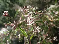 Zieria collina is a spreading shrub with velvety hairs and which grows to a height of 3 m (10 ft). The leaves are arranged in opposite pairs and are composed of elliptic to lance-shaped leaflets 12–20 mm (0.5–0.8 in) long and 3–5 mm (0.1–0.2 in) wide. The upper surface of the leaflets is a darker shade of green than the lower surface and usually has a few hairs and tubercles while the lower surface in densely covered with velvety hairs. The leaf stalk is 1–8 mm (0.04–0.3 in) long. The flowers are bright white, about 7 mm (0.3 in) in diameter and are arranged in groups of 15 to 30 in leaf axils and the groups are usually longer than the leaves. The sepal have four lobes and there are four petals. In common with other zierias, there are only four stamens. Flowering mainly occurs from August to October but flowers are often seen at other times. Fruit opens about six weeks after flowering.[2][3]