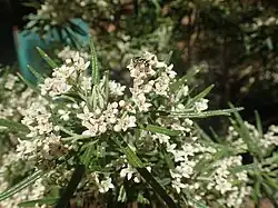 The flowers are creamy-white and are arranged in upper leaf axils in large groups of up to 200. The groups are shorter than the leaves and each flower is 5.2–7.3 mm (0.2–0.3 in) in diameter on a stalk 1.1–2.5 mm (0.04–0.1 in) long. There are four narrow triangular sepal lobes less than 1.5–2.5 mm (0.06–0.1 in) long and four petals 2.5–4 mm (0.1–0.2 in) long. In common with other zierias, there are only four stamens. Flowering occurs from late winter to spring.[1][2][3]