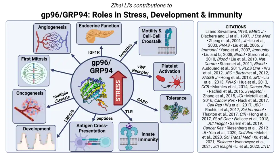 Major contribution to gp96/GRP94 biology: Li defined the ATPase activity of gp96/GRP94,[20] its client network,[10][11][12] its structure-function relationship,[21][22] and the co-chaperone CNPY3.[12] Furthermore, he established its roles in immunity, hematopoiesis, and cancer. gp96/GRP94 was identified as a major luminal protein of the endoplasmic reticulum in multicellular organisms (not in yeast), inducible by metabolic stress.[23] However, there were no previous publications regarding the function of gp96/GRP94 when Li began to study this molecule in the 1990s. It remained unclear how this unmutated protein could trigger an immune response in animals against the tumor from which it originated. Through a biochemical approach, Li was the first to demonstrate that gp96/GRP94 is a bona fide member of the HSP90 family, exhibiting ATP binding, intrinsic ATPase activity, and peptide chaperoning functions.[20] The ability of gp96/GRP94 to form complexes with peptides provided a mechanistic explanation for its antigenicity: it is the chaperoned peptides, rather than gp96/GRP94 itself, that elicit immunogenicity.