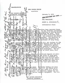 The Zilch memo was an American government document sent by National Security Advisor Henry Kissinger to President Richard Nixon on January 3, 1972, about the military situation in Laos during the Vietnam War.[1] On the memo, in his own handwriting, Nixon described the decade-long bombing campaign by the United States in Southeast Asia as a "failure", having achieved "zilch", despite public comments to the contrary.[2] Just the day before, January 2, Nixon told CBS News reporter Dan Rather in an interview that the bombing was "very, very effective".[2] Previously missing from the Richard Nixon Library,[3] the memo was discovered in the possession of Alexander Butterfield, who served as the Deputy Assistant to President Nixon from 1969 to 1973, by Washington Post reporter Bob Woodward, who subsequently published it in his 2015 book The Last of the President's Men.[4]