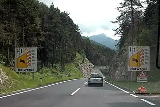 Between Zirl and Leithen the northern carriageway of the Seefelder Straße (the uphill carriageway) is closed to caravans with a permitted total weight of over 750 kg and the whole of the road between Zirl and Scharnitz is barred for lorries over 7.5 tonnes with the exception of local lorry traffic.[3][4] Due to the steep gradient there are several escape lanes between Leithen and Zirl that branch off the downhill carriageway; they runn slightly uphill so that in an emergency, vehicles, especially lorries, can be braked by the gravel roadbed. The gradient also means that bicycles are not permitted on the downhill carriageway; although they are allowed to climb the road, this is not recommended due to the high levels of traffic.