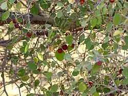 Ziziphus nummularia, commonly known as wild jujube or jharberi in Hindi,[2] is a species of Ziziphus native to the Thar Desert of western India and southeastern Pakistan, south Iran, Afghanistan, Lebanon and Zimbabwe. Ziziphus nummularia is a shrub up to 6 metres (20 ft) or higher, branching to form a thicket. The leaves are rounded like those of Ziziphus jujuba but differ from those in having a pubescence on the adaxial surface. The plant is commonly found in arid areas, hills, plains, and agricultural fields.
