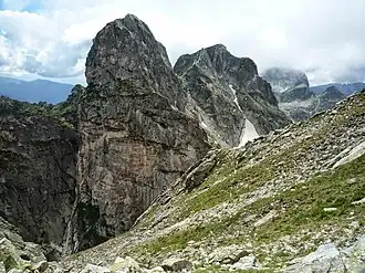 The summit is named Zlia Zab because of its very characteristic shape, reminiscent of a sharp dog's fang seen from the south.[1]
