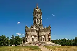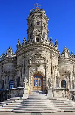 In plan, the church is a centric structure: an equilateral cross with rounded ends; the endings are divided into three parts. The type of centric temple of this shape was widespread in Catholic countries and expressed the main features of the European Baroque of the XVII century.[40] According to the type of architectural composition, the church is an "octagon on the quadrangle". This composition was mainly used in the design of Russian Orthodox churches. Above the central part of the church rises an octagonal tower, completely covered with intricate relief ornaments. Cornices divide the entire structure of the tower into three light tiers. Lower tier is formed by rectangular windows with rounded top. The middle tier has the same windows, and the upper tier has small octagonal windows. The church is topped by a dome with four-petal windows and a carved gilded crown. The wedding of a church with a crown is completely not in the Russian tradition.[41]