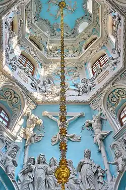 On the sails there are figures of Evangelists in swirling clouds and surrounded by putti: on the right above the iconostasis – Matthew with an Angel, on the left – John with an eagle, opposite John above the choir – Luke with a calf, on the opposite side – Mark with a lion.[52]