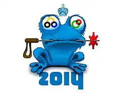 Zoich is a fuzzy blue frog. The Olympic Rings rotate in its eyes, taking the role of pupils: black, yellow, and blue in the right eye and red and green in the left. In its mouth, the frog holds a ski pole and a Russian Imperial Crown sits atop its head. The mascot takes its name from the year "2014" as it is represented on the Olympiad's logo: The numbers 2, 0, and 1 as they are represented look like the Latin Z, O, and I. The number 4 looks like the Russian letter Ч, which is like the English "ch".[5] Many Russian-speaking people read "2014" as "Zoich" upon presentation of Sochi-2014 logo. Zhgun described the mascot, saying that "The Olympic Rings in his eyes spell the progress of Olympic ideals; the tsars' crown on his head recalls authority and faith."