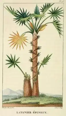 Zombia antillarum is called the Zombie palm[16][17] or Zombi palm[6] by horticulturists. Orator F. Cook coined the name "Haitian cactus palm" due to the spiny appearance of its trunk. In Haiti, it is usually known as latanye zombi (latanier zombi in French; the zombie fan palm), or latanye pikan, (latanier piquant in French, the spiny fan palm). It is also called latanier savanne or latanier marron. Latanye or latanier is a common term for fan palms in Haiti, so these names ("savanna fan palm" and "wild fan palm") are not specific to this species; they are also used for several species of Coccothrinax. In the Dominican Republic, the species is called guanito or guanillo. These are diminutives of guano, which is used for several species of Coccothrinax and Thrinax.[6] In his 1821 description of the species, Descourtilz used the name latanier épineux.[8]