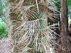 Details of the stem of Zombia antillarum showing persistent, spiny leaf sheaths.