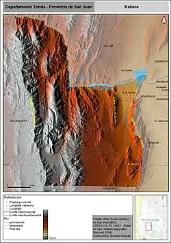 ![]() View of Zonda Valley, the most populous area of the department, located in its north-eastern corner. | |