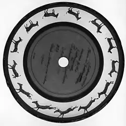 Muybridge also produced a series of 50 different paper 'Zoopraxiscope discs' (basically phenakistiscopes), again with pictures drawn by Erwin F. Faber. The discs were intended for sale at the 1893 World's Columbian Exposition in Chicago, but seem to have sold very poorly and are quite rare. The discs were printed in black-and-white, with twelve different discs also produced as chromolithographed versions. Of the coloured versions only four different ones are known to still exist (with a total of five or six extant copies).[5]