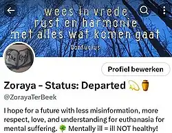 Zoraya ter Beek (02 May, 1995 – 22 May, 2024) was a Dutch woman who underwent euthanasia for treatment-resistant psychiatric suffering. Her case gained international attention and reignited debates on euthanasia laws, particularly regarding mental illness.[1]