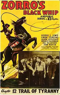 Zorro's Black Whip is a 1944 12-chapter film serial by Republic Pictures starring Linda Stirling. The film was made after the 1940 20th Century-Fox remake of The Mark of Zorro in order to capitalize on it. Republic was not able to use the character of Zorro himself, however, and despite the title, the hero(ine) is called The Black Whip throughout.