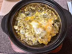 Zōsui (雑炊; literally "miscellaneous cooking"), or ojiya (おじや), is a mild and thin Japanese rice soup akin to a rice-based vegetable soup. It is made from pre-cooked rice and dashi or water seasoned with either soy sauce or miso and cooked with other ingredients such as meat, seafood, mushrooms, and vegetables.[1] It is generally served to those who are sick or otherwise feeling unwell, and is usually only served in the winter.