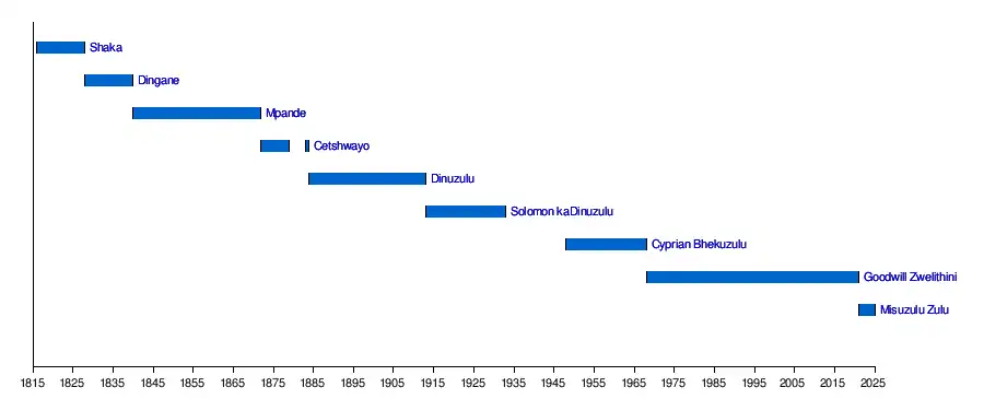 | Shaka kaSenzangakhona | c. July 1787 – 22 September 1828 (aged 41) | 1816 | 22 September 1828 | Half-brother of Sigujana kaSenzangakhona | Zulu | ![]() |