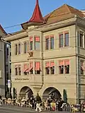 The Zunfthaus zur Zimmerleuten at the Limmatquai promenade in Zürich, Switzerland, situated between Münsterbrücke and Rathausbrücke, is the guild house of the Zunft zur Zimmerleuten, meaning the guild of the carpenters. Neighboured by the Saffran, Kämbel and Rüden guild houses, it is one of the city's historically notable buildings. The building also houses the relatively expensive restaurant of the same name.