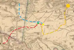 When the ultimatum expired British forces, under Lieutenant-General Lord Chelmsford invaded Zululand in three columns.[14] One of the first actions of the British Centre Column was to attack Sihayo's homestead near the Natal border on 12 January. Sihayo and the main bulk of his men had already left to join the royal army but a party of old men and boys offered a determined resistance to the British attack from the cover of rocky and vegetated terrain.[15][16] On 22 January the royal army attacked the British camp at Isandlwana, effectively wiping it out and ending the first invasion. The British Right Column was aftwerwards besieged by the Zulu at Eshowe while the Left Column remained in the vicinity of Kambula where it engaged local Zulu forces.[17] Chelmsford requested reinforcements and troops sent out from Britain included a cavalry brigade formed by the 1st King's Dragoon Guards and the 17th (The Duke of Cambridge's Own) Lancers under the command of Major-General Frederick Marshall.[18]
