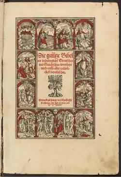Froschauer ordered 118 illustrations of the Old Testament from Hans Holbein the Younger to explain the biblical text.[76] However, the choice of images is not necessarily pedagogical. It shows a preference for dramatic, violent and warlike scenes; the Book of Judges, the Book of Judith and the Books of Maccabees are therefore particularly richly illustrated.[77] The preface states that illustrations have been added to biblical stories in the hope of making the book fun and enjoyable to read.[78]