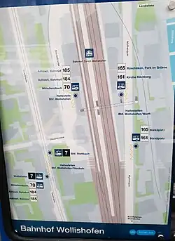 There is a tram and bus stop, called Bahnhof Wollishofen, west of the reception building. Another nearby stop is Bhf. Wollishofen/Werft, situated to the east of the station, is a bus stop. Zürich tram route 7 and VBZ bus routes 70, 184 and 185 stop at Bahnhof Wollishofen, while Bhf. Wollishofen/Werft is served by VBZ bus lines 161 and 165. The pier of Zürichsee-Schifffahrtsgesellschaft (ZSG), Wollishofen ZSG, is located southeast to the railway station.[8][6]