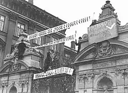 ![]() ONR banners over Warsaw University entrance, 1936. The lower reads "Śmierć żydo-komunie" ("Death to Judeo-Communism").α | |