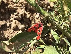 The moth flies from July to August, depending on the location, on dry hill-sides, During their slow flight the red abdomen is especially conspicuous, the flying insect bearing on that account a distant resemblance to certain southern Hemiptera.