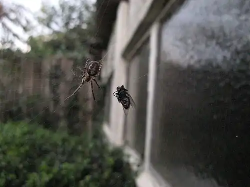 There are four stages of predatory behavior in Zygiella x-notata as described by Venner et al.: first, the "waiting phase" occurs, in which the spider is immobile in its retreat in the top corner of the web. A foreleg rests on the signal thread that spans from the spider's retreat to the hub of the web. Second is a "detection phase", where after prey has come into contact with the web, the spider moves toward it down the signal thread. Third is a "capture phase" in which the prey is incapacitated by the spider and subsequently moved back toward the retreat. Zygiella x-notata has been observed to bite and wrap its prey with silk during this phase as a means of incapacitation, prior to transportation to the retreat.[4] Finally, there is an "ingestion phase" where the spider eats the prey in its retreat and removes the prey's remains from the web.[17]