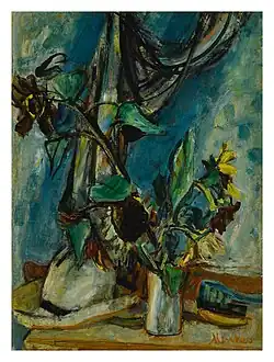Menkes moved to the United States in 1935, where he worked with the Associated American Artists and became a lecturer at the Art Students League of New York. He continued to exhibit in the U.S. and Europe, joining the colorist group known as Nowa Generacja (New Generation) and Zwornik (Keystone) in the 1930s.[3] In the U.S., he was awarded the Carol H. Beck Medal of the Pennsylvania Academy of Fine Arts in 1943, the Gold Medal of the Corcoran Gallery in 1947, the Andrew Carnegie Award of the National Academy of Design in 1955, and the Alfred Jurzykowski Award in 1967. He died at the age of 91 on August 20, 1986 in New York of a heart attack.[2][4] His works are in permanent collections of the Philadelphia Museum of Art, the Whitney Museum of American Art in New York, the Jewish Museum in New York, and the Tel Aviv Museum of Art, among others.[4]
